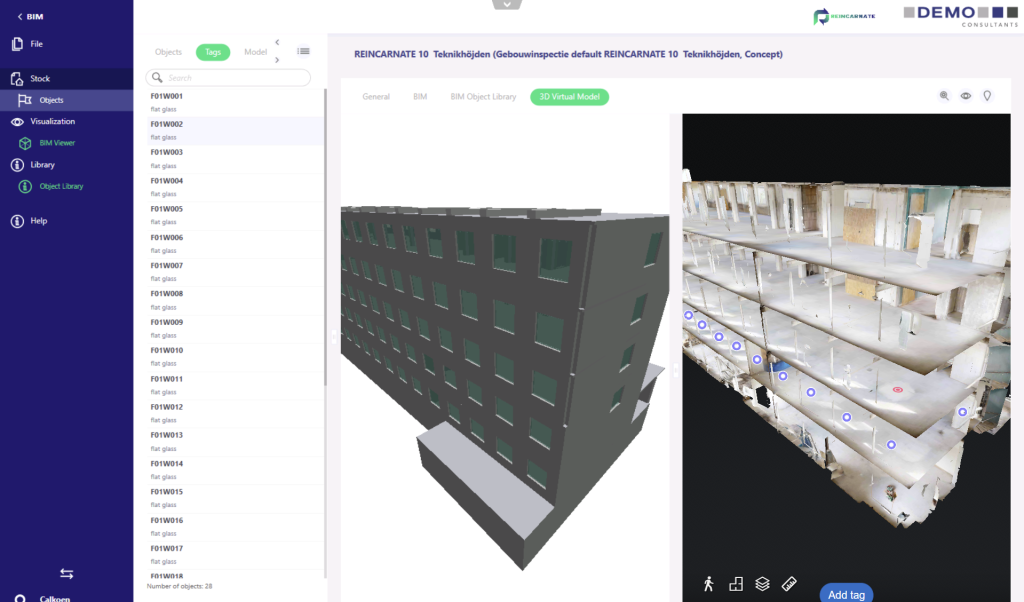Earlier in August, DEMO Consultants and Ragn-Sells tested the latest features of the Circular Potential Information Management (CPIM) platform at the Teknikhöjden building in Sweden. This activity focused on demonstrating how digital workflows can support the upcycling of flat glass from existing buildings. Using a combination of 3D photogrammetry, LiDAR scanning, and BIM integration, the team a fully navigable 3D Virtual Model enriched with detailed component data and equipped with query systems to facilitate the decision-making process.