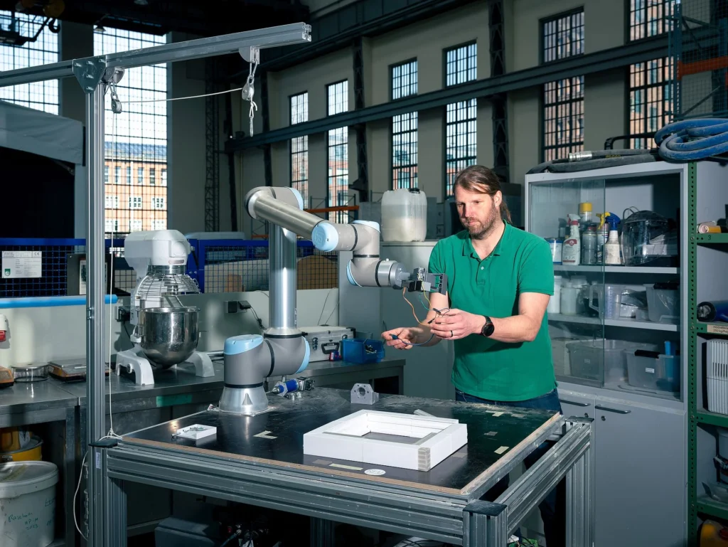 In the Peter Behrens Hall at TU Berlin, Hartmann and his team are using a small robotic arm to investigate how single-glazed windows can be dismantled without damage and reassembled into multi-glazed units. The robot-based method allows components to be reused and entire facades to be redesigned using recovered elements.